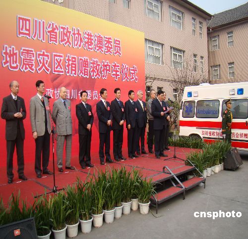 1月14日,參加政協(xié)四川省十屆二次會(huì)議的港澳委員向地震災(zāi)區(qū)捐贈(zèng)了一批救護(hù)車(chē),用以改善地震災(zāi)區(qū)受贈(zèng)醫(yī)療機(jī)構(gòu)醫(yī)療衛(wèi)生設(shè)備缺乏現(xiàn)狀。圖為救護(hù)車(chē)捐贈(zèng)儀式現(xiàn)場(chǎng)。中新社發(fā) 王萌 攝