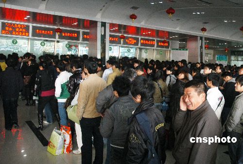 2009年1月15日,福建福州汽車北站的售票大廳排起了長長的購票隊伍。隨著春節(jié)鄰近,福州迎來了省內(nèi)旅客的購票高峰。中新社發(fā) 張 斌 攝