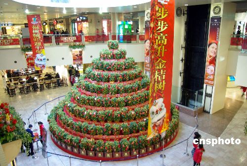 2009年1月25日,北京東方新天地為迎接新春佳節(jié)特制一個高達6米的巨大金桔樹塔,上面掛滿了寫著各式祝福的紅包。中新社發(fā) 九州 攝