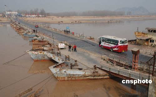 2009年1月29日,車(chē)輛從剛恢復(fù)通車(chē)的濼口浮橋上通過(guò)。由于近期氣溫回升,黃河濟(jì)南段流凌密度降至10%以下,截至上午8時(shí),濼口段流量保持在248立方米/秒以下,持續(xù)一個(gè)多月的凌汛已經(jīng)大幅度緩解。據(jù)濟(jì)南黃河防汛辦公室專(zhuān)家稱(chēng),近期黃河下游不會(huì)形成嚴(yán)重凌汛。濼口浮橋下游的章丘、歷程、濟(jì)陽(yáng)有10段封河,封河長(zhǎng)度在25公里左右。中新社發(fā) 滕越 攝