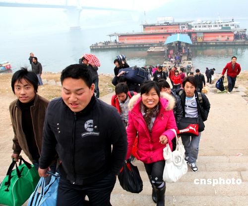 2月1日,47艘客船、高速客船出川,1.5萬多名出川農(nóng)民工返城,三峽庫區(qū)迎來節(jié)后春運首次高峰,海事、公安、港口加大出川旅客進港秩序維護,沒有一艘客船出現(xiàn)超載。中新社發(fā) 望作信 攝