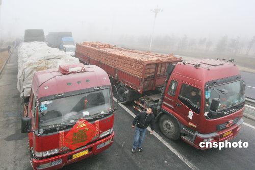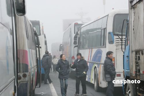 2009年2月1日上午,在同三高速公路江蘇省贛榆縣出口處,車輛等待霧散通行。連日來,江蘇省大部分地區(qū)遭遇持續(xù)大霧天氣,部分地區(qū)能見度不足50米,給旅客出行及運輸帶來影響。當?shù)貧庀蟛块T發(fā)布大霧黃色預(yù)警,交通安全部門提醒旅客要注意出行安全。中新社發(fā) 司偉 攝