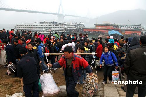 2月3日農(nóng)歷正月初九早8時,長江宜昌港大公橋客運(yùn)碼頭四條躉船無一客人、無一客船,9時,9艘客船同一船閘、同時停泊宜昌港,一時間,涌入宜昌港口的出川大軍疏散成“井噴”之勢。宜昌海事、公安、港口等部門聯(lián)動執(zhí)法,35分鐘時間內(nèi)緊急疏散4500余人,全部是出川農(nóng)民工。據(jù)統(tǒng)計,三峽春運(yùn)期間,常年旅客進(jìn)出客流量約50萬人次,其中外出農(nóng)民工乘船超過40余萬人次。據(jù)悉,三峽庫區(qū)是長江干線跨省春運(yùn)重點(diǎn)航線,而這一航線又是中國內(nèi)河農(nóng)民工乘船的專營航線,節(jié)前單邊返鄉(xiāng)過年,節(jié)后單邊出川進(jìn)城打工,客船單邊旅客、客船高度集中,是中國內(nèi)河不多見的春運(yùn)現(xiàn)象。中新社發(fā) 望作信 攝