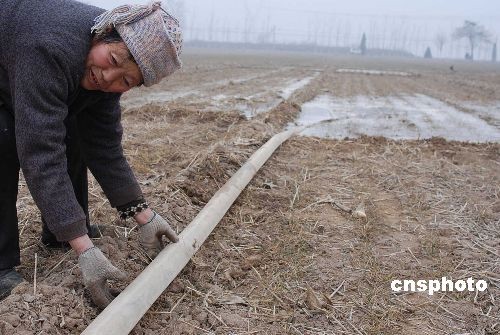 2009年2月4日,山西小麥產(chǎn)地運(yùn)城新絳縣農(nóng)民在全力以赴進(jìn)行抗旱工作。入冬后,山西省受旱面積達(dá)3274萬畝,其中山西小麥主產(chǎn)區(qū)運(yùn)城、臨汾兩地農(nóng)作物受旱面積達(dá)634萬畝,同時有106萬群眾及19萬頭牲畜出現(xiàn)飲水難問題。2月3日,山西省政府防汛抗旱指揮部已發(fā)布干旱橙色預(yù)警(Ⅱ級)并啟動響應(yīng)行動。山西省財政緊急下?lián)芸购蒂Y金1000萬元。中新社發(fā) 高新生 攝