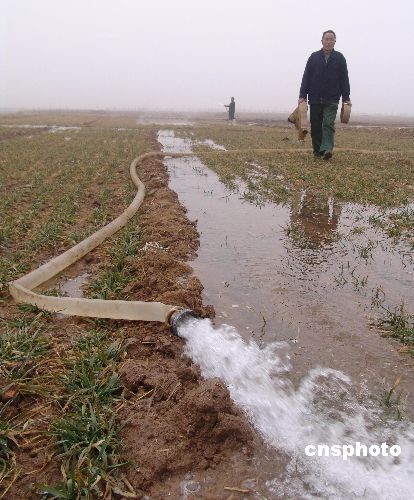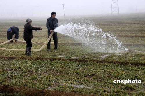 2月5日,山東省臨沂市沂南縣蘇村鎮(zhèn)農(nóng)民在用噴灌澆麥。今年臨沂市小麥?zhǔn)芎得娣e達(dá)到390萬畝,其中重旱面積達(dá)210萬畝。臨沂市因地制宜,推廣“長龍”節(jié)水灌溉技術(shù)!伴L龍”是一種塑料軟管,灌溉澆水時(shí)接在水泵上,通過這種軟管導(dǎo)水入田,并視灌溉情況可隨時(shí)移動(dòng)。中新社發(fā) 杜昱葆 攝