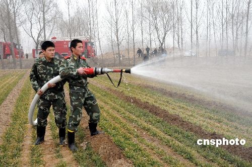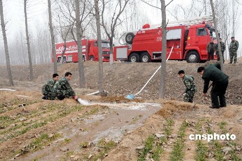 2月6日,河南省濮陽(yáng)市公安消防支隊(duì)官兵把消防車輛開進(jìn)高新區(qū)皇甫路辦事處后皇甫村田間地頭,為貧困家庭澆灌麥田。去年冬季以來,濮陽(yáng)市降雨稀少,旱情十分嚴(yán)重。在抓好執(zhí)勤備戰(zhàn)的同時(shí),濮陽(yáng)消防官兵積極參與抗旱澆麥,受到群眾的歡迎。中新社發(fā) 劉敬寬 攝