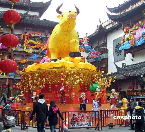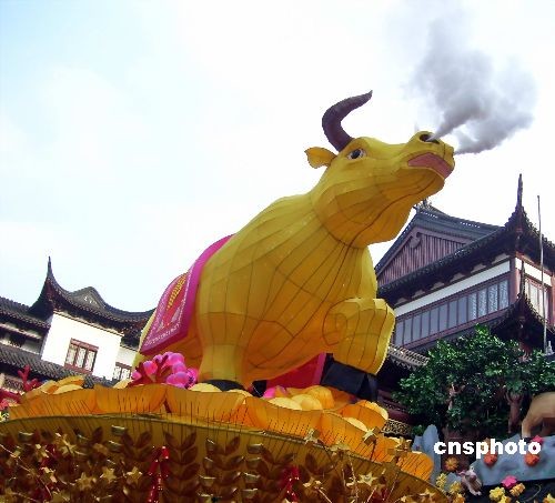 2009年2月6日,一個(gè)長(zhǎng)7米、高3米的巨型“牛燈”在上海豫園元宵燈會(huì)上閃亮登場(chǎng)!芭簟钡谋强走會(huì)冒煙,以應(yīng)和“牛氣沖天”的寓意。中新社發(fā) 井韋 攝