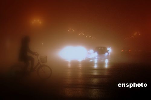 從2月7日晚起,江蘇鹽城市及蘇北地區(qū)出現(xiàn)春節(jié)后的首場大霧,城市街道夜晚能見度不足50米。氣象專家說,由于立春以來的氣溫不斷回升,冷暖空氣交會,近日早晚還將持續(xù)大霧天氣,提請出行的人們和車輛注意交通安全。中新社發(fā) 周晨陽 攝