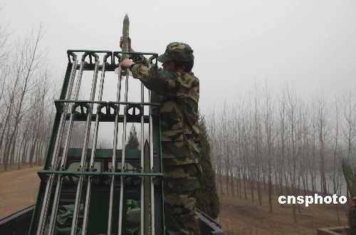 中國許多地方正在遭受嚴(yán)重干旱,各地抓住氣象條件動用人工增雨等辦法以緩解旱情。二月七日下午,安徽省出現(xiàn)有利增雨作業(yè)的天氣過程,十六時許作業(yè)飛機(jī)在蚌埠機(jī)場穿云破霧實(shí)施今年首次飛機(jī)增雨作業(yè)。八日八時、十時、十四時,人工增雨作業(yè)飛機(jī)又連續(xù)三次先后在阜陽、六安、淮北、亳州、淮南、宿州、蚌埠等皖北地區(qū)作業(yè)。同時,安徽旱區(qū)六市十四個縣和兩個區(qū)開展了次地面人工增雨作業(yè)。據(jù)統(tǒng)計,七日下午至八日十六時,安徽省已經(jīng)在干旱嚴(yán)重的皖北地區(qū)實(shí)施四駕次飛機(jī)人工增雨作業(yè),一百多次高炮火箭作業(yè),增雨面積達(dá)十萬平方公里,旱區(qū)普降三毫米以上甘霖,最大降雨量八點(diǎn)五毫米。圖為火箭人工增雨作業(yè)現(xiàn)場。中新社發(fā) 王兵 攝