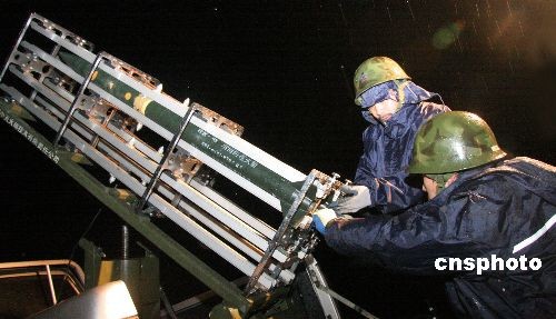 2月9日凌晨許,江蘇連云港市氣象局工作人員在該市陡溝鄉(xiāng)發(fā)射“人工增雨火箭彈”,進行人工增雨。江蘇連云港市自去年入冬來,遭遇罕見的無雨天氣,致使全市235.6萬畝農(nóng)作物受旱較嚴(yán)重。當(dāng)?shù)貧庀蟛块T根據(jù)對降雨云系監(jiān)測,決定在2月8日夜間至9日凌晨發(fā)射“人工增雨火箭彈”,進行人工增雨。截止目前共發(fā)射“人工增雨火箭彈”32枚,全市普遍降雨量達到5毫米以上,望眼欲穿的“喜雨”終于從天而降,為久旱的大地送來了甘霖。 中新社發(fā) 王振 攝