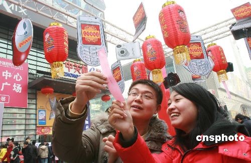 2月8日,人們在北京中關(guān)村競猜謎語。為迎接元宵佳節(jié),北京中關(guān)村舉行元宵燈謎會(huì),用“電腦”、“相機(jī)”、“鼠標(biāo)”、“手機(jī)”等造型懸掛的燈謎,吸引了不少市民駐足猜謎。中新社發(fā) 陳曉根 攝