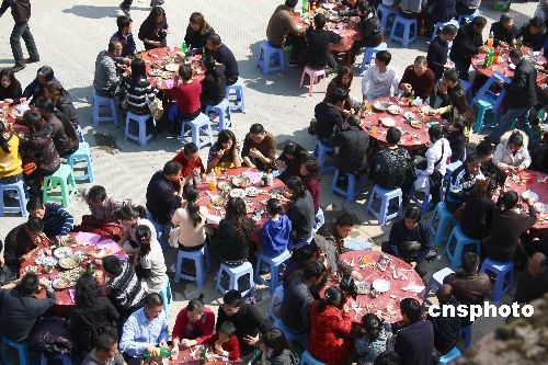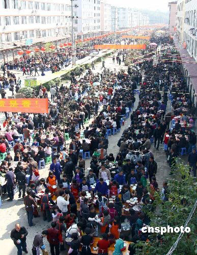 圖為位于雅陽的兩千多桌宴席。2月9日,中國傳統(tǒng)的元宵節(jié),在浙江省泰順縣,在這一天就會邀請四方的賓客相聚在洲嶺、雅陽、西旸等地。今年雅陽的“百家宴”歷史以來規(guī)模也是最大的一次,達到一千多桌,一萬多人,且和文化旅游相組合,推出了許多的節(jié)目,F在,“百家宴”已經成為一種帶有民間聯誼性質的活動,人們歡聚一堂聯絡感情,互送祝福,譜寫盛世和諧新篇章。中新社發(fā) 鎬璽 攝