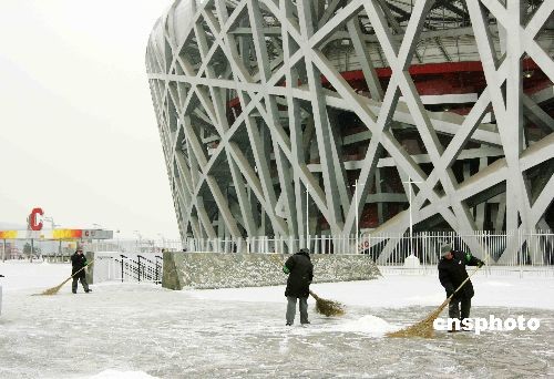 2月17日,北京迎來(lái)2009年第一場(chǎng)雪,奧林匹克公園的工作人員在清掃積雪,迎接游人到來(lái)。中新社發(fā) 陳曉虹 攝