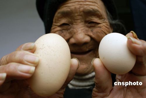 2月24日,山東省棗莊市山亭區(qū)北莊鎮(zhèn)后峪村76歲老人秦傳蘭家的一只母雞產(chǎn)下一枚重127克的巨型蛋,該雞蛋長(zhǎng)約8厘米,重127克,有3個(gè)普通雞蛋大。中新社發(fā) 王森王 攝