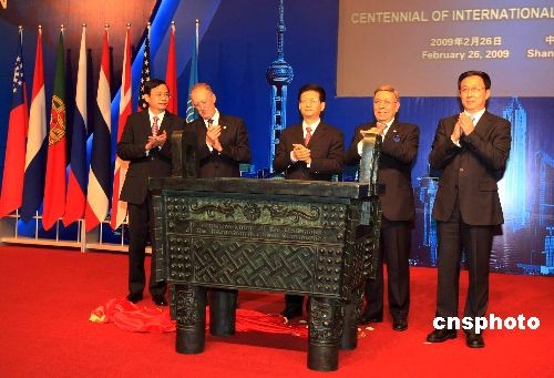 2009年2月26日,“萬國禁煙會”百年紀念活動在上海舉行,來自泰國、英國、美國、越南等16個國家的政府代表團以及聯(lián)合國毒品和犯罪問題辦公室、國際麻醉品管制局代表出席。中國國務委員、公安部部長孟建柱(中)與參會代表一起為“萬國禁煙會”百年紀念鼎揭幕。中新社發(fā) 湯彥俊 攝