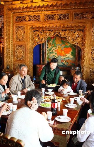 隨著在昆明定居的藏族民眾越來越多,獨具特色的藏族飲食也越來越受到昆明市民的喜愛,酥油茶、青稞酒和牦牛肉這些來自藏區(qū)的綠色食品更是受到熱捧。圖為藏歷新年期間,昆明最有名的“瑪吉阿米香格里拉風(fēng)情宮”藏式餐廳人滿為患,昆明市民紛紛到此感受藏歷新年的別樣風(fēng)情。中新社發(fā) 劉冉陽 攝