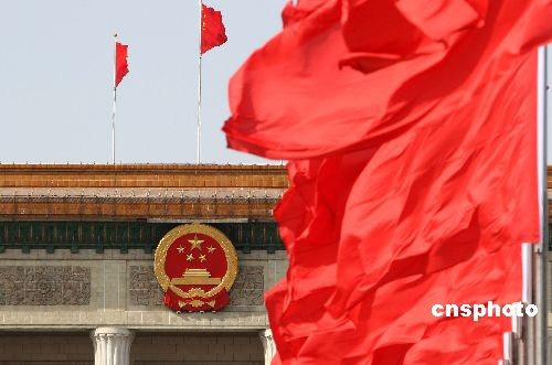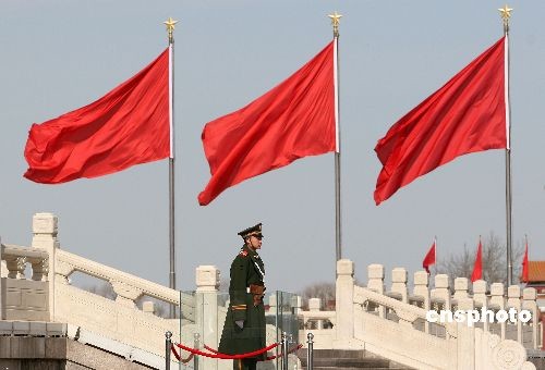2009年3月1日,“兩會(huì)”即將召開,北京天安門廣場及周邊建筑掛起了紅旗,廣場上一片喜慶祥和氣氛。中新社發(fā) 魯谷 攝