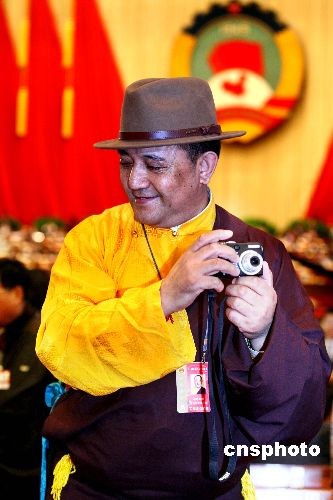 全國(guó)政協(xié)十一屆二次會(huì)議3月3日下午在人民大會(huì)堂開幕,一名少數(shù)民族委員拿著相機(jī)在大會(huì)上捕捉精彩瞬間。中新社發(fā) 宋吉河 攝