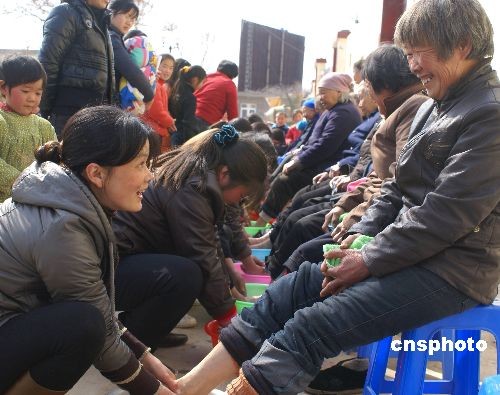 3月7日,河南省濟(jì)源市王屋鎮(zhèn)愚公村的媳婦們?cè)跒槠牌畔茨_。 為迎接“三八”婦女節(jié),濟(jì)源市王屋鎮(zhèn)愚公村組織村里的媳婦為婆婆洗腳,從而提倡孝道,增進(jìn)婆媳感情,促進(jìn)農(nóng)村和諧社會(huì)建設(shè)。中新社發(fā) 平白 攝