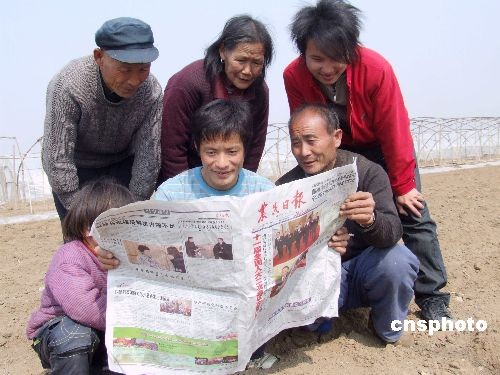 3月9日,山東省棗莊市山亭區(qū)店子鎮(zhèn)返鄉(xiāng)農(nóng)民工張士軍(右二)在農(nóng)活空閑時間和村民們一起在地頭學習溫家寶總理作的《政府工作報告》。連日來,棗莊市山亭區(qū)人民通過電視、電腦、報紙等媒體搜索溫家寶總理作的《政府工作報告》,在山亭區(qū)形成一種學習熱。中新社發(fā) 王啟蒙 攝