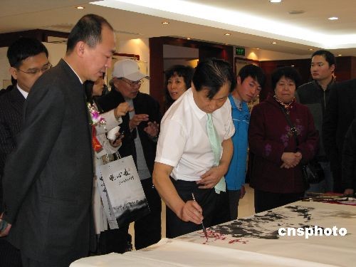 三月十日,北京的眾多書畫名人參加了第六屆中國名家書畫慈善拍賣會啟動儀式。拍賣會將于三月十五日在北京舉行,拍賣所得利潤將全部用于中國西部生態(tài)建設和綠色扶貧事業(yè)。圖為著名國畫家、吳東魁藝術館名譽館長、世界華人書畫院院長吳東魁現(xiàn)場為義賣活動創(chuàng)作書畫作品。中新社發(fā) 王彤 攝
