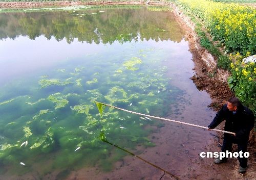 2009年3月10日,湖北省荊門市掇刀區(qū)麻城鎮(zhèn)胡沖村農(nóng)民鄭家清承包的魚塘暴發(fā)藍藻,導致不久前投放的價值2000多元的魚苗缺氧成批死亡。據(jù)鄭家清稱,他承包的16畝魚塘近幾年來在春夏時節(jié)不同程度的暴發(fā)藍藻,需要用藍礬(五水硫酸銅)才能將藍藻滅掉。中新社發(fā) 劉君鳳 攝