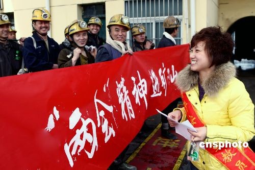3月11日,安徽恒源煤電公司宣傳員在井口給礦工宣傳“兩會”精神。自3月5日“兩會”召開以來,安徽恒源煤電公司組織了“兩會”精神在礦山宣傳隊,向礦工們宣傳了“兩會”召開的意義和“兩會”上有關(guān)礦山安全生產(chǎn)、百姓切身利益等相關(guān)內(nèi)容。中新社發(fā) 黃啟軍 攝
