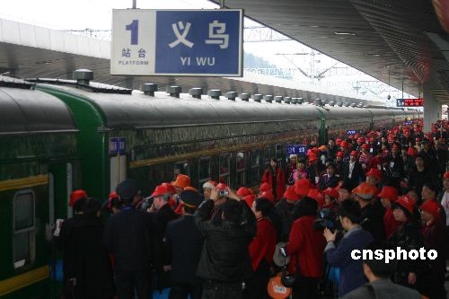 3月12日下午,大陸首個(gè)火車專列赴臺(tái)旅游團(tuán)從浙江義烏出發(fā)。千余名大陸游客將通過(guò)火車專列至廈門,渡海過(guò)金門后乘飛機(jī)赴臺(tái)灣旅游。據(jù)組織者浙江中旅出境中心總經(jīng)理曹軍介紹,這也是大陸赴臺(tái)旅游人數(shù)最多的單個(gè)團(tuán)隊(duì),本月14日和4月初將還有2000多名游客通過(guò)這一方式赴臺(tái)旅游。中新社發(fā) 王旻 攝