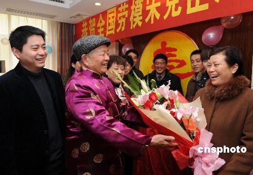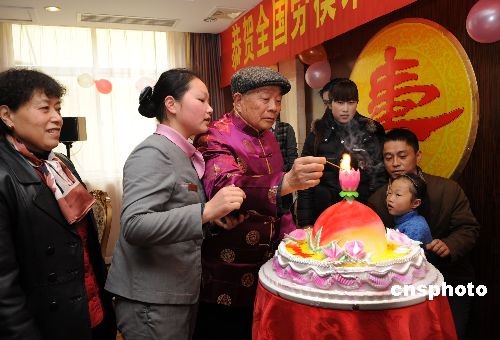 3月13日,安徽六安市為全國勞動模范宋克臣祝賀80壽辰。宋克臣1948年參加革命,1958年,他發(fā)明轟動全國的自動售糧器;2008年汶川地震發(fā)生后,他把自己發(fā)明的《高層建筑應(yīng)急逃生裝置》專利無償捐獻給國家。60年來,宋克臣通過刻苦自學(xué),共發(fā)明創(chuàng)造45項各類實用技術(shù),成為遠近聞名的勞模發(fā)明家。中新社發(fā) 陳超平 攝