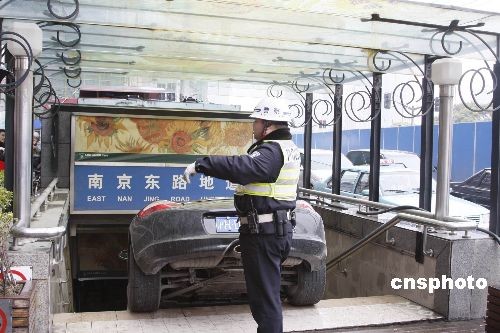 三月十三日下午一點(diǎn)左右,一輛保時(shí)捷豪華跑車(chē),誤打誤撞駛?cè)肷虾!巴鉃┦颂?hào)”著名老建筑門(mén)前的“南京東路人行地道”內(nèi),女司機(jī)在發(fā)現(xiàn)是人行通道后趕緊剎車(chē)。在搶險(xiǎn)過(guò)程中,一名上前幫忙牽引的工人被擠壓成重傷。中新社發(fā) 宣克炅 攝