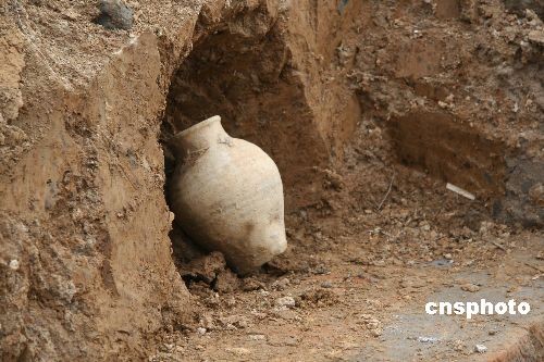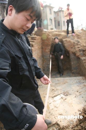 3月16日,施工人員在正在興建的安徽巢湖北外環(huán)施工工地發(fā)現(xiàn)兩座古墓。發(fā)掘的兩座古墓被確證為東漢晚期墓,其中一古墓葬為土坑墓,另一座為磚坑墓。據(jù)該市文管所同志介紹,這兩座漢墓均被盜過(guò),而且被盜一空,在發(fā)掘時(shí),發(fā)現(xiàn)盜墓賊留下一個(gè)很大的盜洞,直通墓中央。從盜墓賊盜墓的舉動(dòng)和第二座漢墓墓磚結(jié)構(gòu)及墓磚上的花紋判斷,此墓墓主應(yīng)該有些身份,多少有些隨葬品,然而,發(fā)掘人員除了發(fā)掘出一些瓦罐的碎片,挖出惟一一只完整的陶罐。此只陶罐不是在墓坑挖出的,而是在墓坑外二十公分處。據(jù)文管所同志分析,此罐可能是后人祭祀留下的,或是盜墓賊丟下的。中新社發(fā) 李遠(yuǎn)波 攝