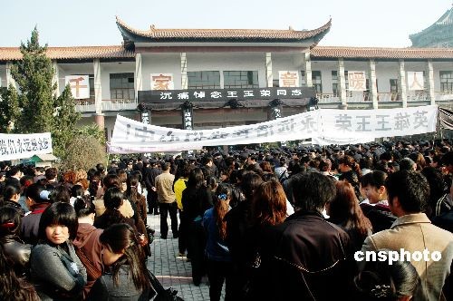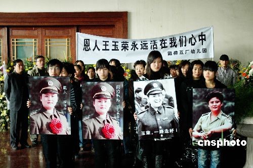 3月18日,王玉榮同志的追悼會(huì)在鄭州殯儀館舉行,公安部,河南省市領(lǐng)導(dǎo)及省會(huì)各界群眾參加了追悼會(huì)。王玉榮3月14日因病在鄭州去世,終年48歲。 王玉榮生前曾迎著歹徒的炸藥包,成功解救28名幼兒和兩名教師,先后參與20多起大要案偵破,獲得過全國公安系統(tǒng)一級(jí)英模、全國“三八紅旗手”、全國杰出青年衛(wèi)士、中國十大女杰等殊榮。中新社發(fā) 賈建偉 攝