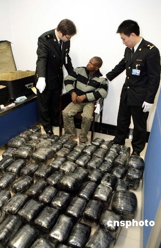 近日,北京首都機場海關(guān)在一男性旅客的行李中查獲毒品大麻可疑物72包,毛重87.25公斤。此案是首都機場海關(guān)旅檢現(xiàn)場今年首次查獲采用大批量客帶貨方式走私毒品入境案。嫌疑人在通關(guān)過程中采用極為少見的運帶方式運帶毒品。中新社發(fā) 雷虹 攝