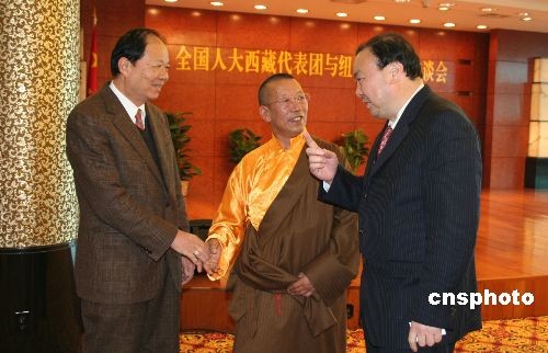 正在美國訪問的中國全國人大西藏代表團18日與紐約當地僑學界舉行座談,相互交流。圖為代表團團長、全國人大代表、西藏自治區(qū)人大常委會副主任新雜·單增曲扎活佛(中)與紐約當地僑領親切交談。中新社發(fā) 魏晞 攝