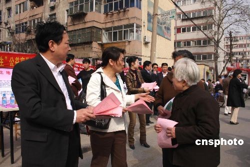 三月十九日上午,河南省強(qiáng)制隔離戒毒所所長(zhǎng)陳新民(左)向社區(qū)居民發(fā)放禁毒公開(kāi)信。當(dāng)日,陳新民率領(lǐng)干警深入社區(qū)門(mén)口,給居民講解毒品危害,勸居民遠(yuǎn)離毒品。中新社發(fā) 王中舉 攝