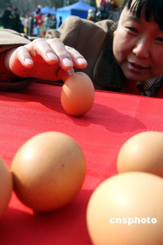 三月二十日,是中國二十四節(jié)氣中的春分。北京春分朝陽民俗文化藝術節(jié)閃亮登場,民眾紛紛“豎”雞蛋迎春分!按悍值,蛋兒俏”,中國春分時節(jié)的“豎蛋游戲”,目前已成為世界性的游戲。中新社發(fā) 任海霞 攝