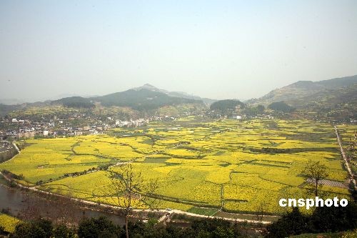 陽(yáng)春三月,貴州省貴陽(yáng)市開(kāi)陽(yáng)縣禾豐鄉(xiāng)油菜花盛開(kāi),一片片的金黃油菜花形成一幅美麗畫(huà)卷。中新社發(fā) 彭年 攝