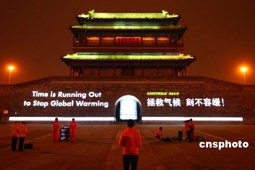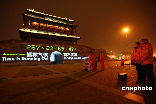 3月23日,在世界氣象日當天,國際環(huán)保組織綠色和平在北京永定門城樓啟動拯救氣候倒計時活動,希望藉此傳達世界變暖已經(jīng)迫在眉睫的危機感。2009年12月,聯(lián)合國氣候變化會議將在丹麥首都哥本哈根舉行,屆時各國領導人將就未來應對氣候變化的全球行動簽署協(xié)議。這將是繼2005年生效的《京都議定書》后又一具有劃時代意義的全球氣候協(xié)議書,將對地球未來的氣候變化產(chǎn)生重要影響。中新社發(fā) 富田 攝