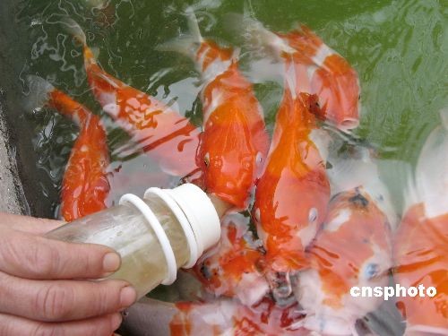 3月25日,在湖北宜昌公園,用奶瓶進食的“吃奶魚”引來許多市民圍觀。該魚是原產(chǎn)日本的錦鯉,壽命在百歲以上,奶瓶裝的是高檔飼料。中新社發(fā) 韓玉洪 攝