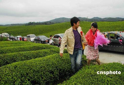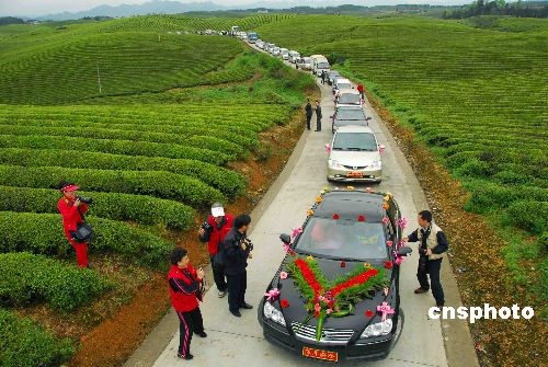 2009年3月28日,在貴州省湄潭縣生態(tài)萬(wàn)畝茶場(chǎng),一對(duì)當(dāng)?shù)匦氯伺e行隆重的婚禮,浩浩蕩蕩的迎親隊(duì)伍在蔥綠的茶園中格外醒目,給豐收的茶鄉(xiāng)帶來(lái)無(wú)限生機(jī)。改革開(kāi)放以來(lái),國(guó)家出臺(tái)的一系列政策,給現(xiàn)在的農(nóng)村帶來(lái)了新氣象,讓農(nóng)村人得到了實(shí)惠,生活更加富裕。中新社發(fā) 張?zhí)炝?攝