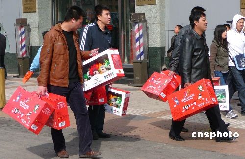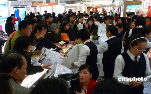 2009年3月31日,北京王府井奧運(yùn)特許商品店,顧客竟相搶購(gòu)各類奧運(yùn)紀(jì)念品。當(dāng)日,手提大包小裹奧運(yùn)紀(jì)念品的人們成為金街一道靚麗風(fēng)景。按照相關(guān)規(guī)定,奧運(yùn)特許商品銷售日期截止到31日24時(shí)。北京一些大型商場(chǎng)內(nèi)的奧運(yùn)特許商品銷售點(diǎn)紛紛以超低價(jià)格進(jìn)行拋售。中新社發(fā) 玉龍 攝