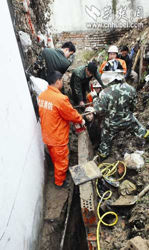為保證被困人員安全同時防止第二次塌方,消防員迅速找來四根粗大的木料,將周邊松動的水泥墻死死頂住。實施救援時,消防員首先嘗試用風(fēng)鎬鑿碎溝底的水泥管,幾分鐘后很快鑿穿,不料余師傅的右腿依然動彈不得;接著找來兩個氣墊,通過腳踩增壓,以求擴(kuò)大余師傅右腿所在的空間,結(jié)果效果不理想;繼而又找來千斤頂,還是無濟(jì)于事。發(fā)現(xiàn)只有吊起坍塌的墻體,才能從根本上解決問題。于是調(diào)來吊車,隔著院墻伸出吊臂,正好坍塌墻體上有個排水孔,消防員設(shè)法將鋼絲繩繞過了排水洞。吊車司機(jī)小心翼翼地操作,既要減輕被夾者的痛苦,又要繞過坍塌現(xiàn)場的線纜,而且盡可能在起吊過程中確保墻體不能斷裂。幸好,起吊墻體四周泥土較為松軟,11時20分左右,墻體被成功吊起,消防戰(zhàn)士迅速將余師傅抱出水溝。劉蔚丹 饒純武 黃康 攝