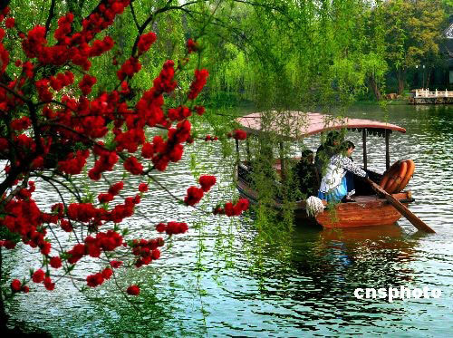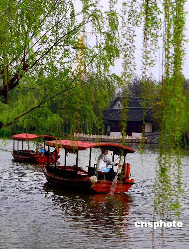 4月8日,揚(yáng)州著名的風(fēng)光旅游區(qū)花紅柳綠,春意盎然。當(dāng)?shù)芈糜尾块T新招募的一批大學(xué)生“船娘”正在瘦西湖上帶著游客欣賞春光。揚(yáng)州大學(xué)生當(dāng)“船娘”就業(yè)前曾引起新聞媒體界關(guān)注,如今大學(xué)生們接受培訓(xùn)后相繼上崗,成為新的靚麗風(fēng)景。中新社發(fā) 宋吉河 攝