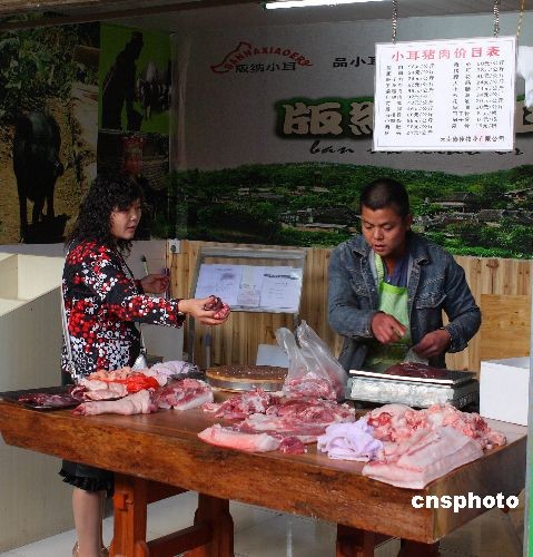 近日,產(chǎn)自云南西雙版納的珍稀品種小耳豬在昆明上市,每公斤瘦肉標(biāo)價(jià)九十八元,被市民稱為“天價(jià)”豬肉。版納小耳豬具有2000多年歷史,是全國(guó)唯一由本土野豬馴化而來(lái)的本地豬種,2002年被列入《國(guó)家級(jí)畜禽品種資源保護(hù)名錄》,由西雙版納當(dāng)?shù)厣贁?shù)民族在原始森林放養(yǎng),是真正的“生態(tài)豬肉”。甫一上市,便受到不少昆明市民的青睞。圖為來(lái)購(gòu)買小耳豬肉的昆明市民。中新社發(fā) 劉冉陽(yáng) 攝