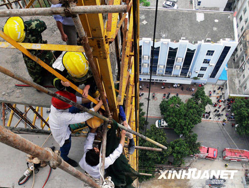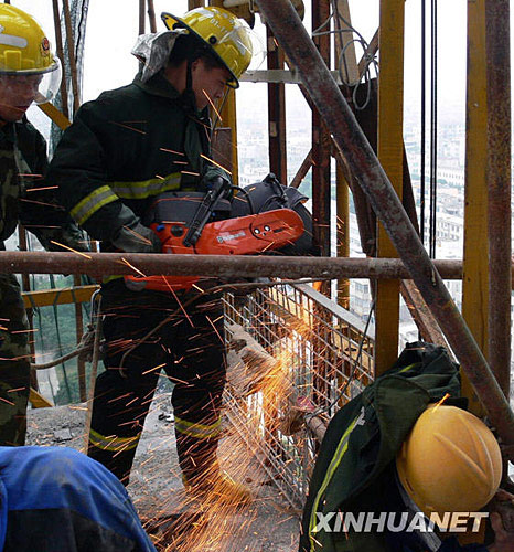 4月11日,在廣西北海市深圳路一個施工工地,消防官兵正在營救被困工人,被困者身穿藍(lán)衣,手腳被升降機(jī)吊架卡住。當(dāng)日上午,在廣西北海市深圳路一個施工工地,一名工人不慎被升降機(jī)吊架卡住困在19樓。北海市消防支隊(duì)官兵接到報(bào)警后迅速趕赴現(xiàn)場,用切割機(jī)切斷鋼板,及時將被困工人救出送往醫(yī)院救治。由于救援及時,該工人無生命危險(xiǎn)。
