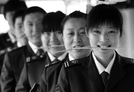 15日,濟(jì)南10路公交車駕駛員咬著筷子練習(xí)微笑服務(wù)。當(dāng)日,為給乘客提供微笑服務(wù),該車隊對駕駛員進(jìn)行“笑臉迎全運(yùn)”培訓(xùn),按照標(biāo)準(zhǔn)進(jìn)行練習(xí),要求只能露出6到8顆牙齒,為達(dá)要求,司機(jī)在訓(xùn)練微笑時,都會咬著一根筷子。(本報記者 王鴻光 通訊員 吳林 攝)