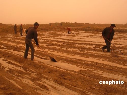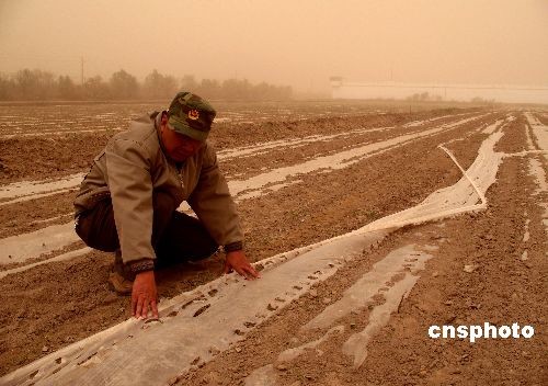 4月16日下午1點(diǎn)30分左右,距離新疆喀什市300多公里外的新疆生產(chǎn)建設(shè)兵團(tuán)農(nóng)三師小海子墾區(qū),遭遇沙塵暴侵襲,能見度一度不足50米,部分已經(jīng)出苗的棉田滴灌帶和地膜遭到破壞。肆虐的沙塵暴給當(dāng)?shù)鼐用裆a(chǎn)生活、交通以及春耕春播工作帶來不利影響。據(jù)新疆氣象部門介紹,當(dāng)天新疆喀什地區(qū)莎車、澤普、麥蓋提、葉城四縣遭遇短時(shí)沙塵暴天氣,一些縣城能見度不足600米,最大風(fēng)速達(dá)16米每秒。中新社發(fā) 肖妮娟 攝
