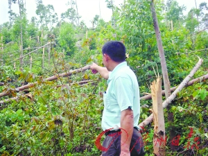 “半夜聽到呼呼的風(fēng)聲,隱約看到有白影在移動,接著冰雹就砸下來了!碑(dāng)夜正在值守的中興村村委會書記馮文安回憶道。昨日凌晨2時50分至3時10分,一股強勁的龍卷風(fēng)在臨田村北部的山林出現(xiàn),從臨田村村邊的水田和果林掠過。