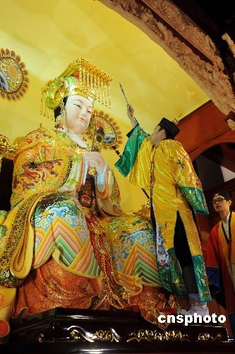 4月18日,是“天上圣母”媽祖誕辰1049年紀(jì)念日。經(jīng)兩年多時間復(fù)建的福州馬尾船政天后宮亦于當(dāng)日舉行媽祖金身開光大典儀式后,正式對信眾及游人免費開放。媽祖塑像是由福建莆田籍著名工藝美術(shù)大師佘國平設(shè)計并建造完成。塑像采用福州傳統(tǒng)脫胎漆器工藝,所有彩繪均使用礦物彩,可經(jīng)千年不褪;手工按金工藝,其光澤度足以和鍍金相媲美。中新社發(fā) 鄭祚聲 攝