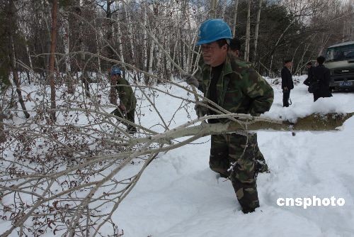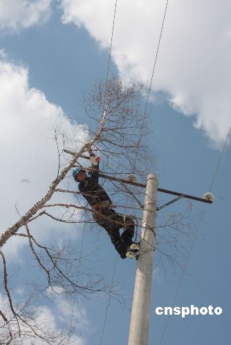 4月23日,當(dāng)牡丹江市電業(yè)搶修人員將三道林場(chǎng)內(nèi)最后一處電線桿上的刀閘閉合,7000多戶因暴雪導(dǎo)致斷電的人家,終于重新恢復(fù)正常的生產(chǎn)生活。 4月21日,黑龍江省牡丹江市出現(xiàn)雨夾雪天氣,其中牡丹江市三道林場(chǎng)的局部林區(qū)因當(dāng)?shù)亍靶夂颉庇绊懺馐鼙┭┮u擊,最深處的積雪厚度達(dá)到1米以上,林區(qū)內(nèi)的一些林木被大雪壓斷,通過(guò)林區(qū)內(nèi)的部分供電線路短路。從4月21日至4月23日,牡丹江市電業(yè)系統(tǒng)出動(dòng)100多名搶修人員奮戰(zhàn)在40多公里的林區(qū)供電線路上,及時(shí)排除短路故障及線路險(xiǎn)情。直到4月23日下午1點(diǎn)30分,各個(gè)停電村屯才陸續(xù)恢復(fù)供電。中新社發(fā) 莊文斌 攝